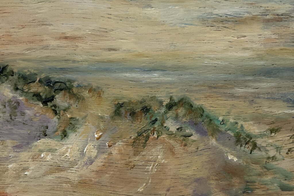 De houten paneeltjes, beschilderd met olieverf, hebben bewust geen titel, nergens is bebouwing te zien. Er zijn geen kerktorens, paaltjes of dieren. Je bent als toeschouwer alleen in de ruimte, vrij om te voelen en te associëren.